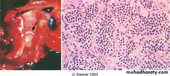 Originate in mainstem bronchi, protrude into lumen and often present with early airways obstruction.Histologically, composed of nests of uniform cells that have regular round nuclei, rare mitoses, and little pleomorphism.