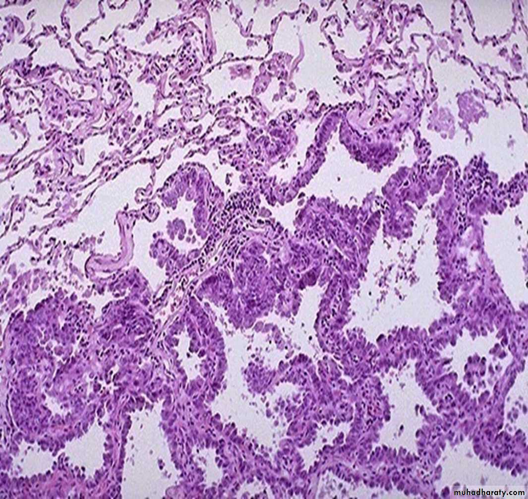 They assume a variety of forms, including acinar (gland forming), papillary, and solid types.Bronchiolo-Alveolar Carcinoma-A type of adenocarcinoma that arises from the bronchiolo-alveolar regions Forms single or multiple nodule(s) which may coalesce to produce pneumonia- like consolidation