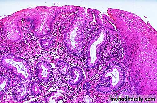 Intestinal metaplasia: the mucosa may become partially replaced by metaplastic columnar cells and goblet cells of intestinal morphology.Atrophy as evidenced by marked loss of the mucosal glands. Parietal cells, in particular, may be absent in the autoimmune form.