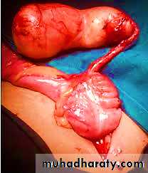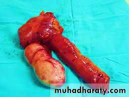 • Obstructed appendix containing inspissated mucin or• Tumor : mucinous cystadenoma or mucinous cystadenocarcinoma.