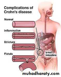 1. Fibrosing strictures, particularly of the terminal ileum (intestinal obstruction)2. Fistulas formed to other loops of bowel, urinary bladder, vagina, or perianal skin, or into a peritoneum. In the latter focal abscesses may occur.