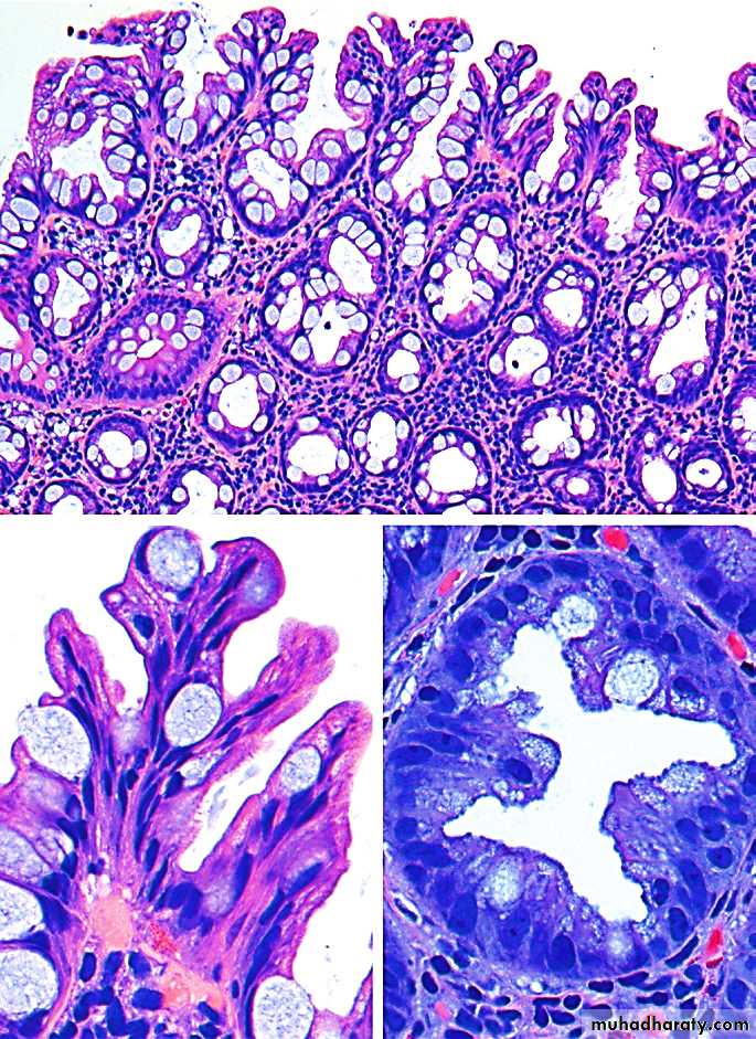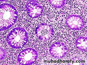 1. Acute mucosal inflammation: there is neutrophilic infiltration of the surface & crypt epithelium that eventually collects within the lumen of the crypts forming crypt abscesses.2. Chronic mucosal damage: