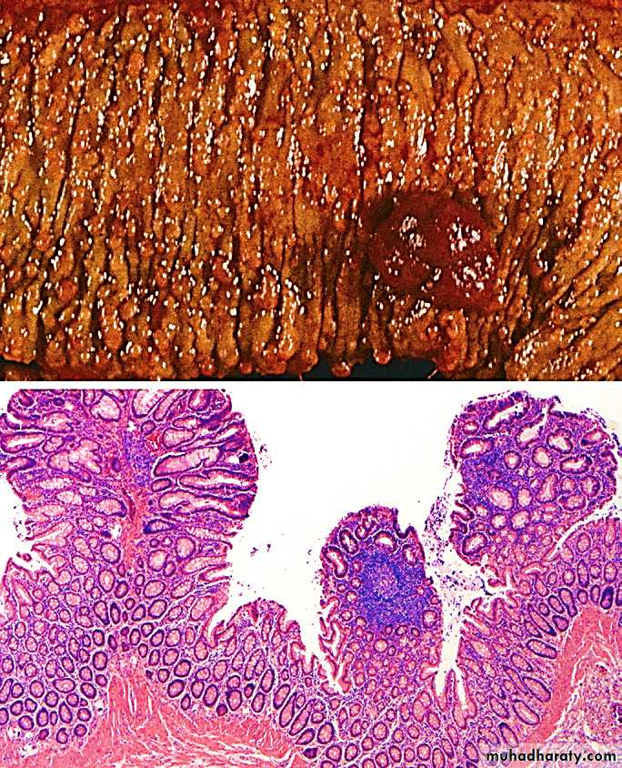 Adenomas are intraepithelial neoplasms that range from small, often pedunculated lesions to large neoplasms that are usually sessile. The prevalence of colonic adenomas increases progressively with age.Males and females are affected equally. Adenomatous polyps are divided into three subtypes on the basis of the epithelial architecture