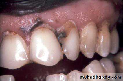 These lesions are on the root surface close to the gingival margin. They are darkly coloured and leathery in texture. These are slowly progressing lesions and some are cavitated. This woman is in her 70s. She has a dry mouth and rheumatoidarthritis (secondary Sjögren’s syndrome). It is not easy for her to clean, but with helpwith cleaning, fluoride toothpaste, and fluoride varnish application, these lesions can be arrested.