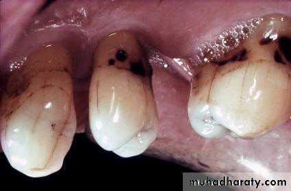 Inactive root surface caries lesions which are entirely dark and hard on probing.These are scar tissue resulting from previousactive caries lesions! Imagine if a dentist had drilled and filled such lesions