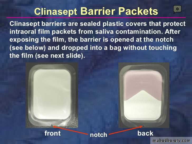 • Tube Side; Is solid white and has raise dump in one corner. Its stippled to aid in preventing the film package from slipping when it is held against the oral mucosa by the patient fingers.