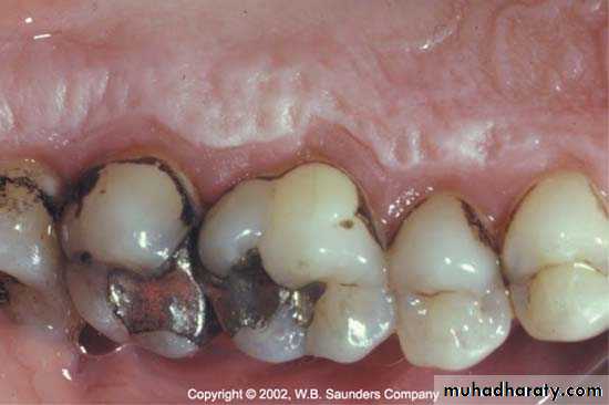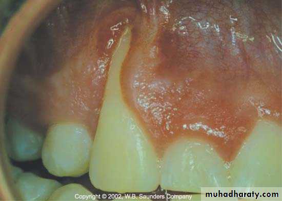 • Diffuse grayish discoloration & leukoplakia of gingiva.