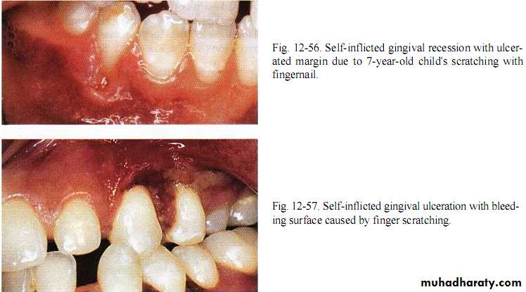 Lip,cheek,toothpick,fingernail or pin bitting may induce trauma from occlusion.Application of fingernail pressure against gingiva or incorrect tooth brushing.