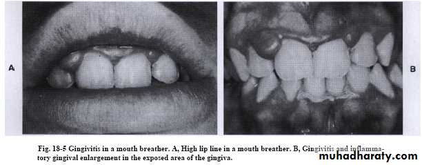 Mouth breathingGingivitis;erythema,edema,enlargement & surface shining in exposed area(occur in the maxillary anterior region).