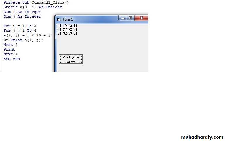 ملاحظة : من الممكن التصريح عن المصفوفة ضمن قسم التصاريح العامة General Declaration عندها ستكون المصفوفة مرئية لكافة إجراءات وتوابع النموذج.