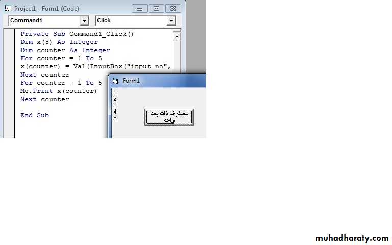 اكتب برنامجا بلغة بيسك لقراءة وطباعة مصفوفة ذات بعد واحدلاحظ أن X(counter) هو متغير (Variable) تتغير قيمته عندما ندخل قيمة جديدة.