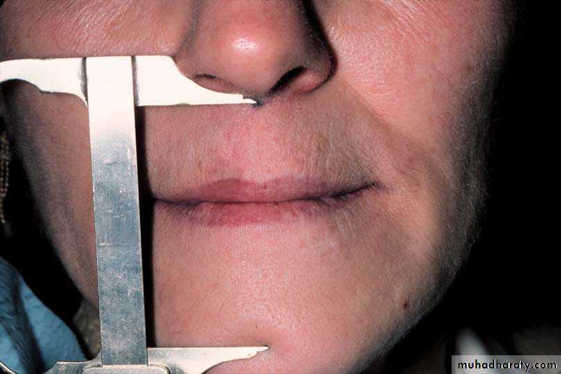 Measurement of a fixed landmark of the face by a special scale called the sorenson profile scale. The Sorenson Profile Scale measurement was taken by placing the nasion locator of the instrument firmly in the depression at the bridge of the nose and raising the chin seat until it lightly touched the most inferior and anterior border of the chin. Or by using Willis bite gauge which is designed to measure the distance from the pupil of the eye to the rima oris and the distance from the nasal spine to lower border of the mandible when measurement is equal the jaw at rest.Recording the occlusal vertical dimension (mechanical methods):