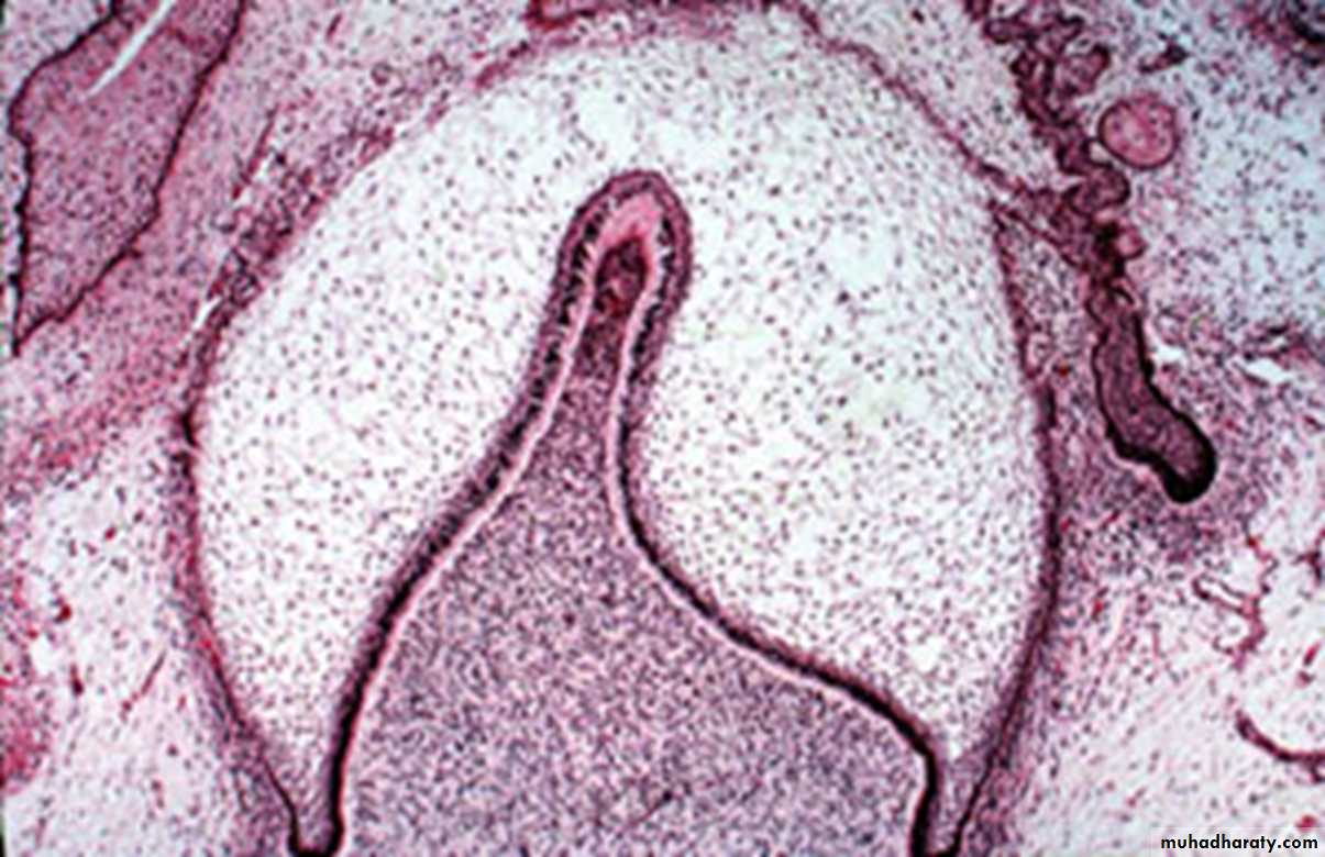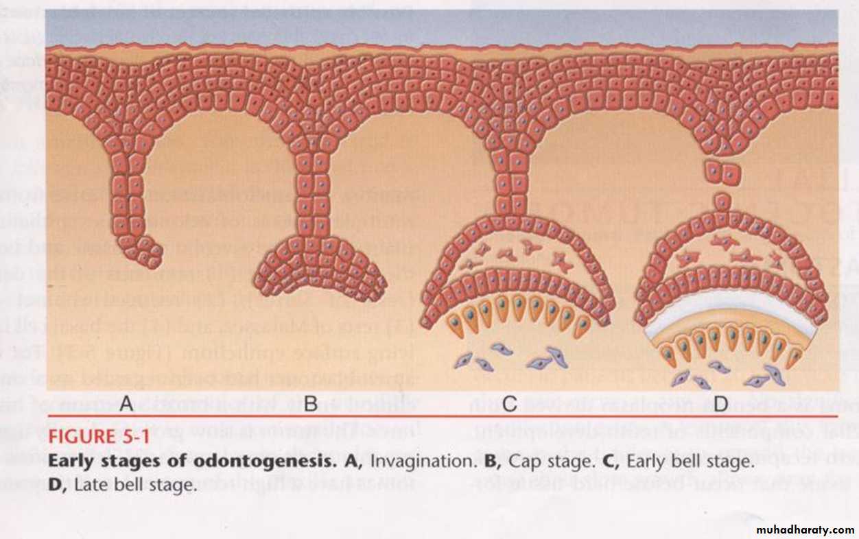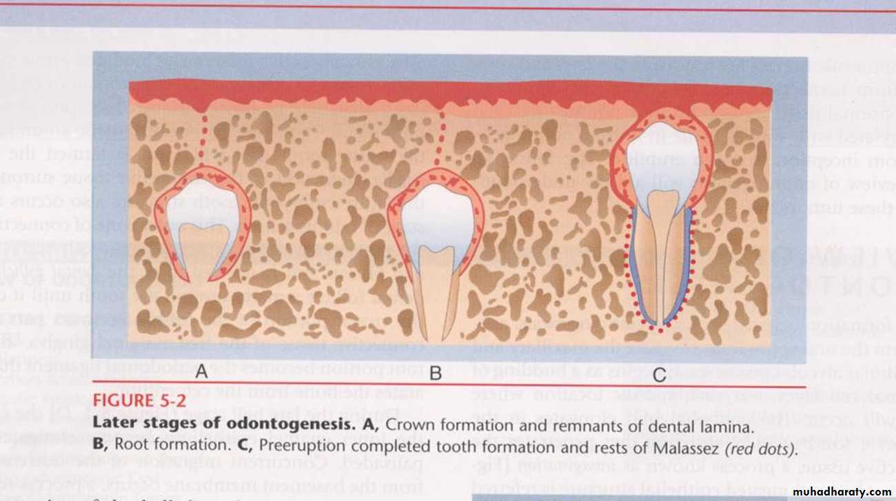 There are many types, and the majority are rare. Odontogenic tumours may be derived from odontogenic epithelium (dental lamina, reduced enamel epithelium, rests of Serres, rests of Malassez) or products of odontogenic mesenchyme (dental follicle, dental papilla, pulp, periodontal ligament) or both in varying proportions. The dental follicle gives rise to the inner half of the lamina dura of the socket, so lesions of bone can be odontogenic too.