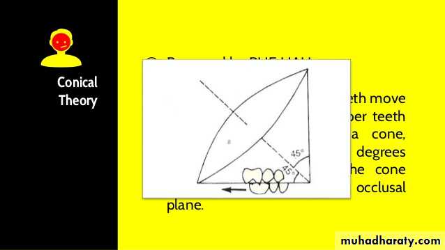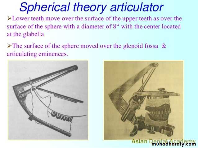 According to this theory, mandibular teeth move over the surface of the maxillary teeth as over a surface of a cone generating an angle of 45 degree with occlusal plane.Spherical theory of occlusion: