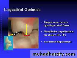 Lingual cusp contacts opposing fossaMandibular cuspal inclines are shallow (0-10) degree