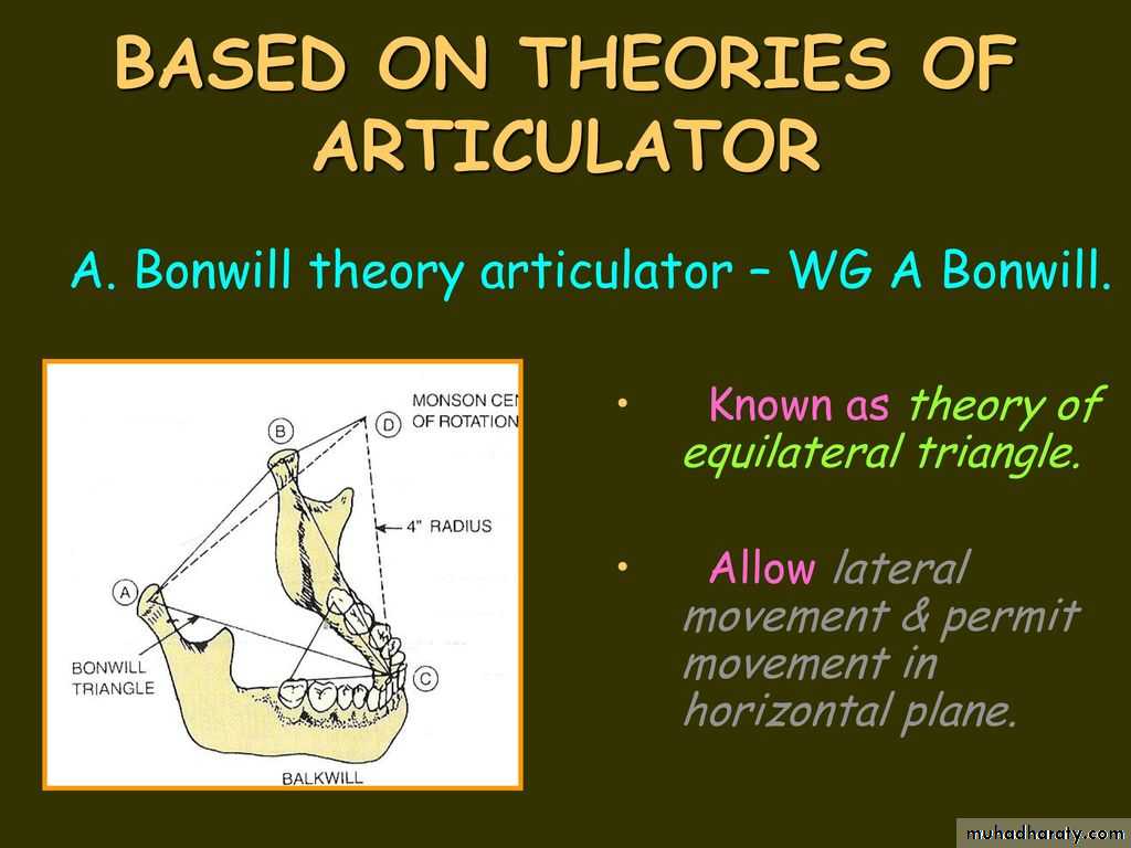 Bonwills theory of occlusion:According to this theory, the teeth move in relation to each other as guided by the condylar and the incisal guidances. The distance between the condyles is equal to the distance between the condyle and the midpoint of the mandibular incisors.