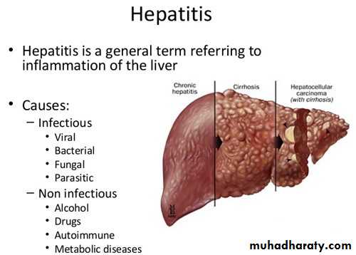 1) Infectious (hepatitis A, B, C, D and E viruses, infectious mononucleosis and tuberculosis)
