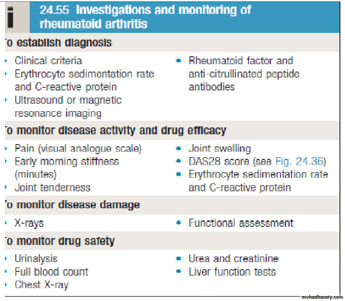 the most helpful laboratory procedure. The fluid is inflammatory, with more than 10,000 white blood cells and a predominance of polymorphonuclear leukocytes, typically 80% or more. Rheumatoid factor, an IgM antibody directed to IgG, is found in 80 to 90% of patients with RA.... XR-Findings