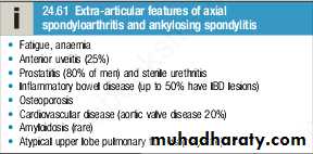 Fatigue is a major complaint and is common to all SpAs, but its cause is unknown.Acute anterior uveitis is a common extra-articular feature, which occasionally precedes joint disease.
