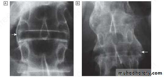 X-rays of the sacroiliac joint show irregularity and loss of cortical margins, widening of the joint space and subsequently sclerosis, joint space narrowing and fusion.Lateral thoracolumbar spine X-rays may show anterior ‘squaring’ of vertebrae due to erosion and sclerosis of the anterior corners and periostitis of the waist.