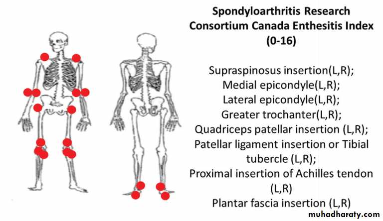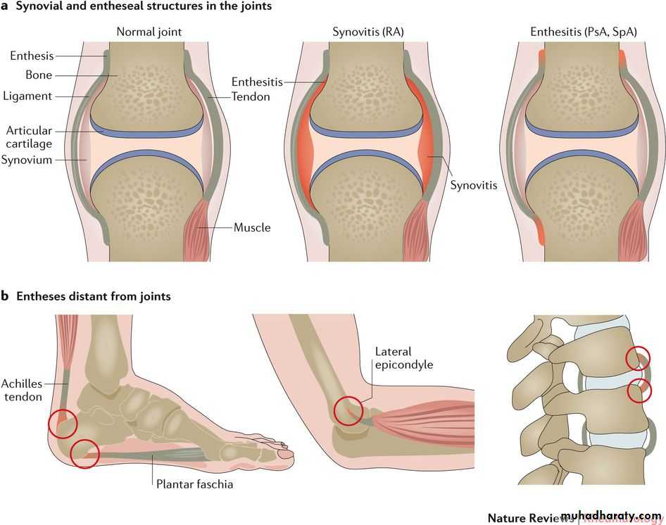 Entheses that are typically affected include Achilles’ insertion, plantar fascia origin, patellar ligament entheses, gluteus medius insertion at the greater trochanter and tendon attachments at humeral epicondyles.