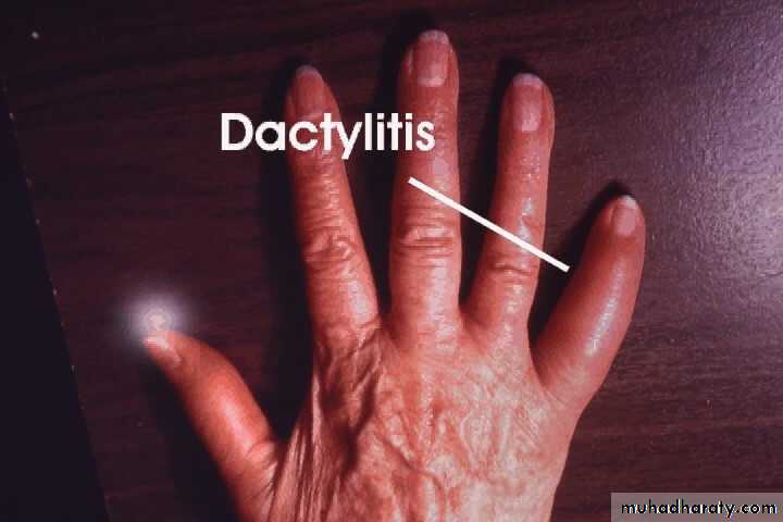 A hallmark lesion of all SpAs is enthesitis, which is inflammation at the site of a ligament or tendon insertion into bone. Dactylitis, inflammation of a whole finger or toe, may also occur