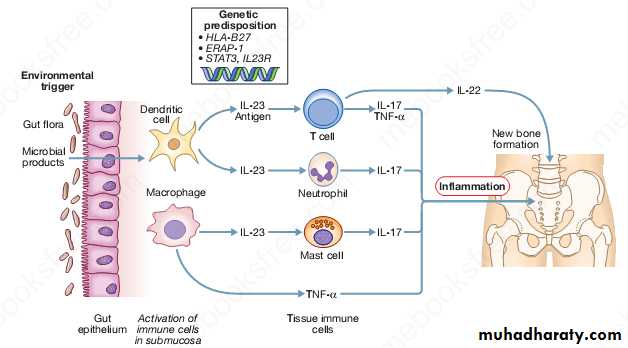 SpA are thought to arise as the result of an aberrant host response to infection and abnormal mucosal immunity mediated through changes in the IL-12,IL-23, and Th17 axis.