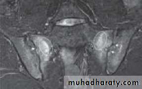 Coronal MRI short T1 inversion recovery (STIR) sequence showing bilateral sacroiliitis in axial spondyloarthritis.Management