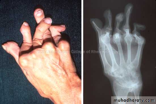 Much of the hand deformity often results from tenosynovitis and soft tissue contractures.