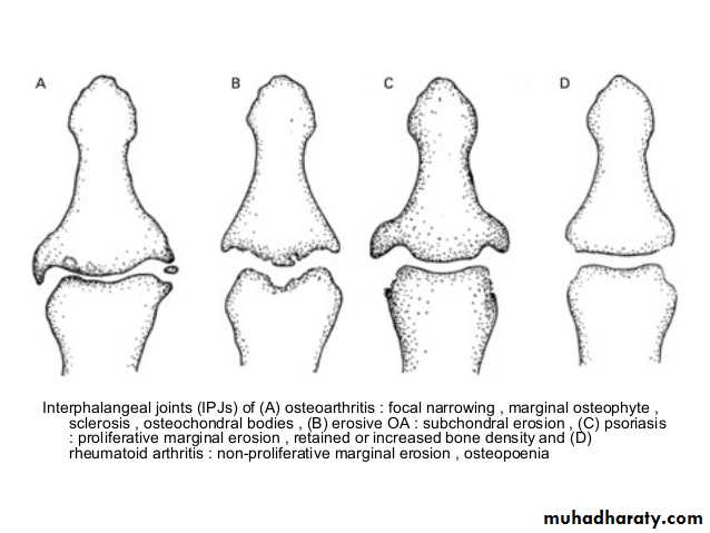 X-rays may be normal or show erosive change with joint space narrowing. Features that favour PsA over RA include the characteristic distribution of proliferative erosions with marked new bone formation, absence of periarticular osteoporosis .