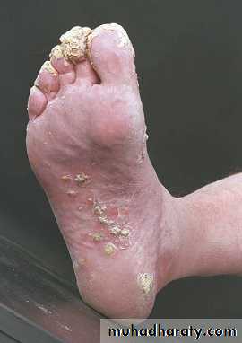 Keratoderma blennorrhagica, which begins as discrete waxy, yellow–brown vesico-papules with desquamating margins, occasionally coalescing to form large crusty plaques on the palms and soles of the feet