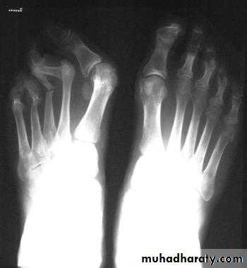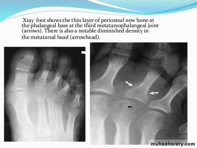 In chronic or recurrent disease, X-rays show joint space narrowing and proliferative erosions.Another characteristic feature is periostitis, especially of metatarsals, phalanges and pelvis, and large, ‘fluffy’ calcaneal spurs.