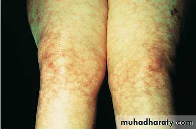 Other skin manifestations include periungual erythema (reflecting dilated capillary loops), vasculitis and livedo reticularis , which is also a common feature of the antiphospholipid syndrome .