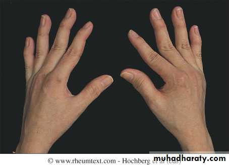 Polyarthritis –non erosive ,small joints of hand and wrist, deformities are uncommon.