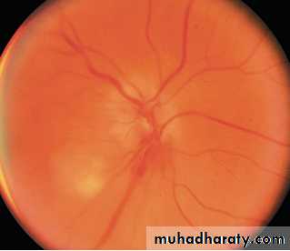 and loss of vision. The optic disc is pale and swollen, the retinal veins are dilated, and several flame-shaped hemorrhages and a cotton-wool spot (retinal infarct) are visible.