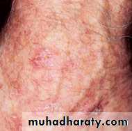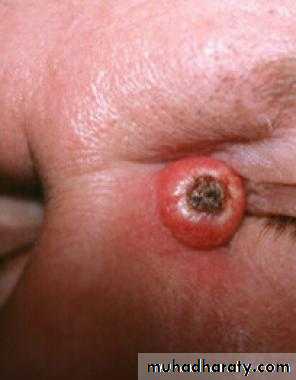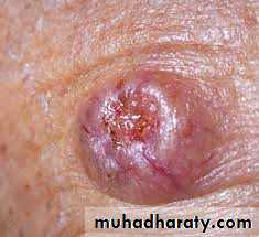 1. Nodular BCC: a. The most common type, usually presenting as a single lesion consisting of pearly papules with telangiectasias, pruritus, and occasional bleeding.b. Lesion breakdown over time leads to nodulo-ulcerative BCC (“Rodent ulcer”).
