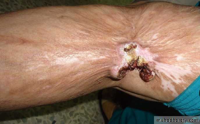 7-Marjolin’s ulcer: SCC arising in a chronic wound (i.e., chronic burn scars and pressure sores) secondary to genetic changes caused by chronic inflammation.