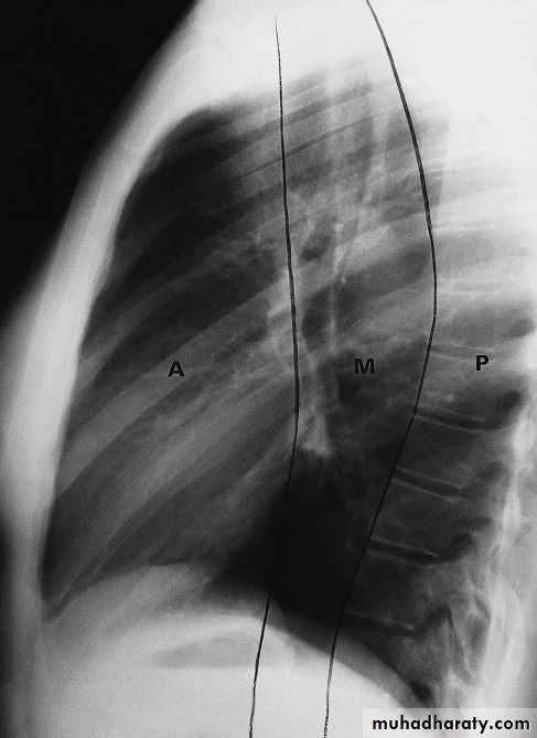 Frontal and lateral chest radiographs usually localize a mediastinal mass to a structure within the anterior, middle, or posterior mediastinal compartments. For instance, if the contours of a lesion are outlined by air and seen above the clavicles, then the lesion must be in the posterior mediastinum. Conversely, if the contours of a lesion are lost at the thoracic inlet level, it must be anterior