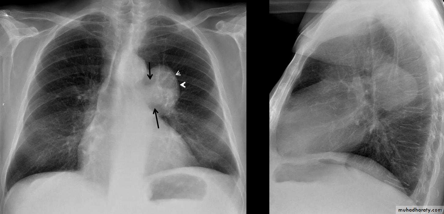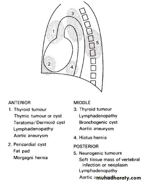 Lesions in the middle mediastinum include thoracic aortic aneurysms, hematomas, neoplasms, adenopathy ,esophageal lesions, diaphragmatic hernias (hiatal or Morgagni type), and duplication cysts. Any middle mediastinal lesion associated with the aorta should be considered an aneurysm until proven otherwise.