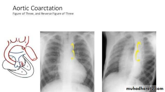 figure of 3 sign: contour abnormality of the aorta with inferior rib notching : Roesler sign in Coarctation of the aorta"box shape" heart in Ebstein anomaly