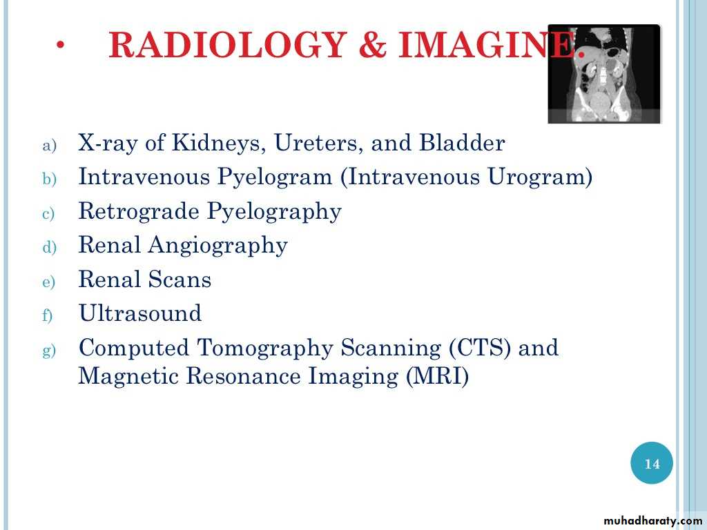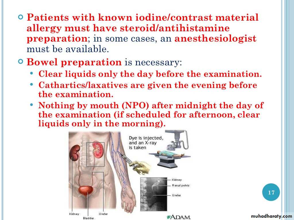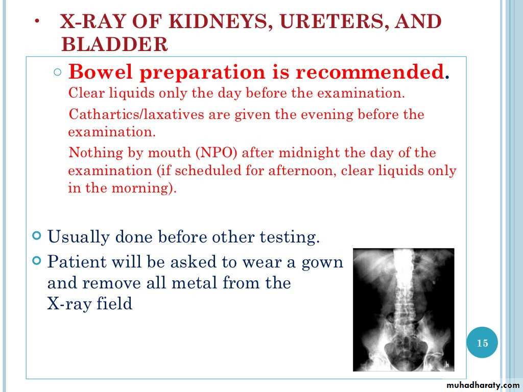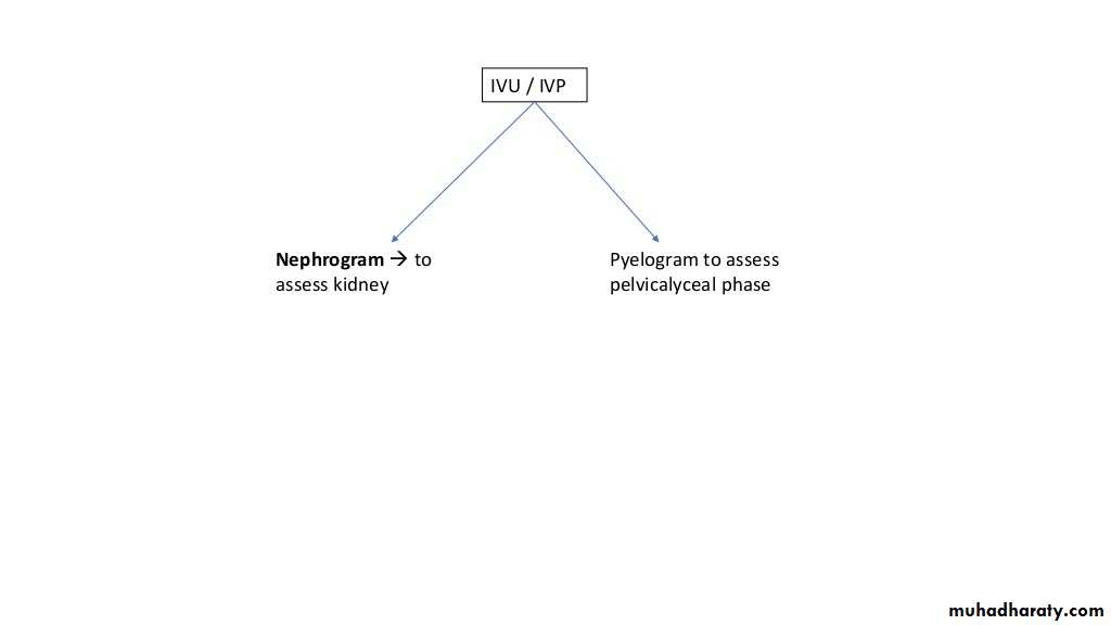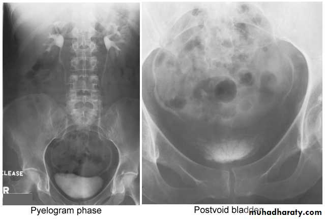 A. First a plain x-ray of the abdomen is taken before the injection of the contrast media, also known as A KUB (kidney, Ureter and Bladder). Calcification & stones may be obscured & missed by contrast media if plain film not takenfirst .B. Films taken after injection of contrast’ medium: