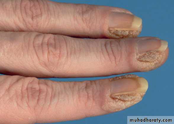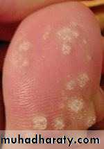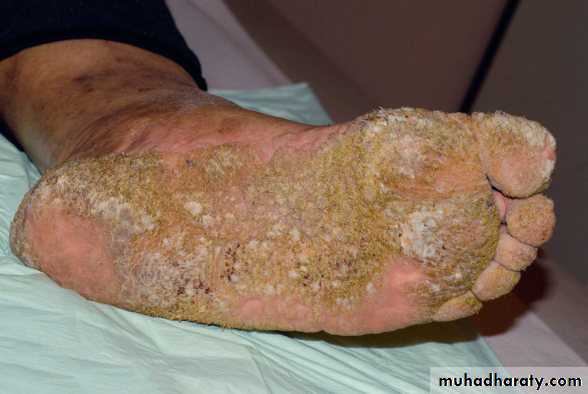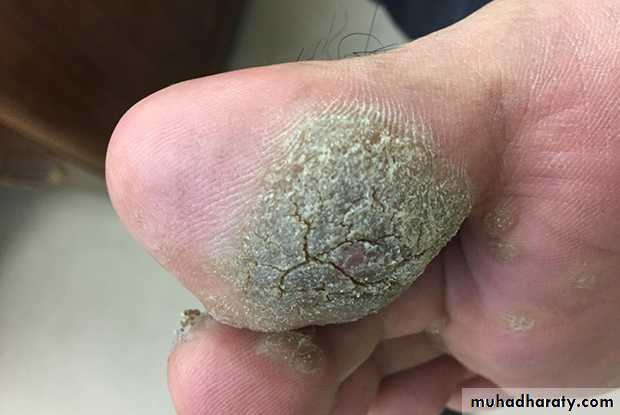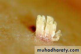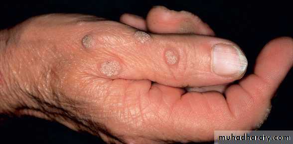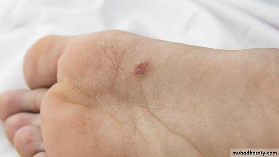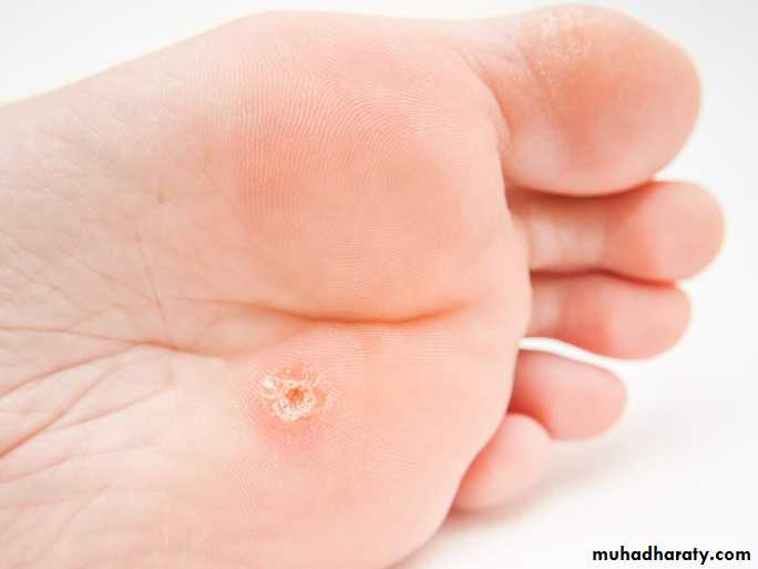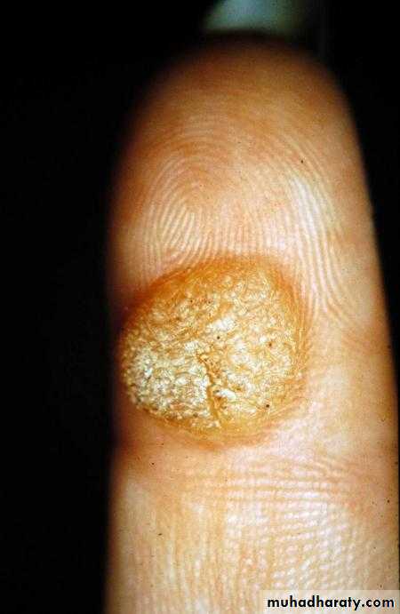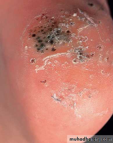 Cause: HPV- 1, 2 & 4.appear as thick, endophytic papules on the palms, soles, and lateral aspects of the hands and feet.