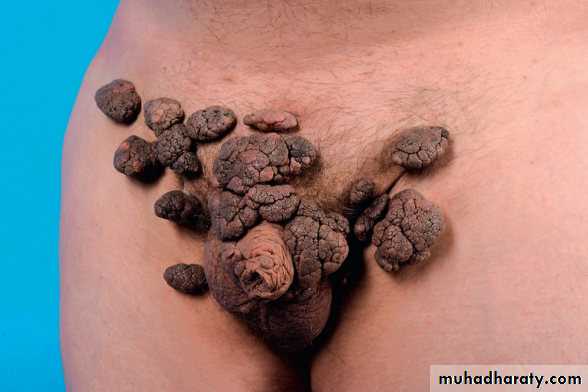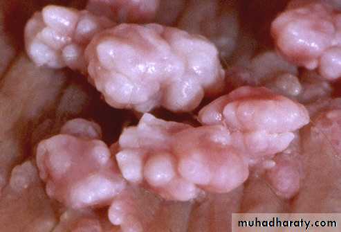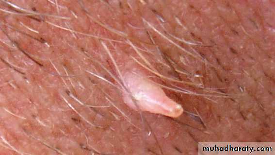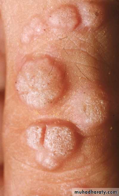 Occur mostly on the face, in adults male and spread by shaving.Ano-genital warts