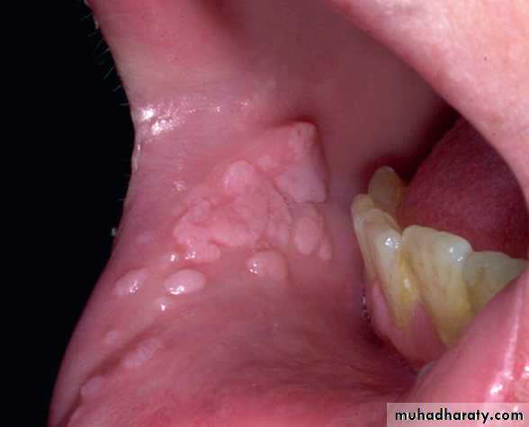 multiple, confluent warty lesions associated with HPV-6 or -11 are found in the oral cavity or the nasal sinuses.The development of these lesions is believed to be promoted by smoking, X-irradiation, and chronic inflammation. Patients with oral papillomas