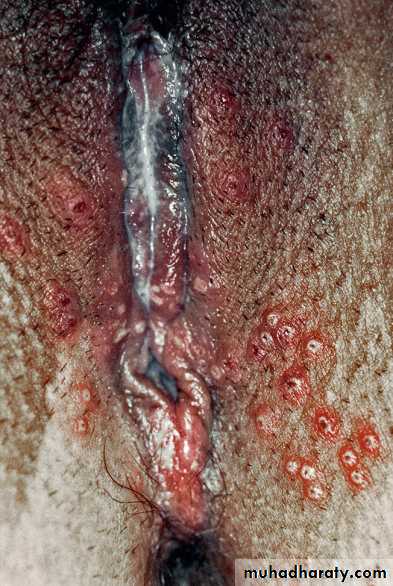 In women, lesions often also involve the cervix, buttocks, and perineum and may be associated with inguinal adenopathy and dysuria