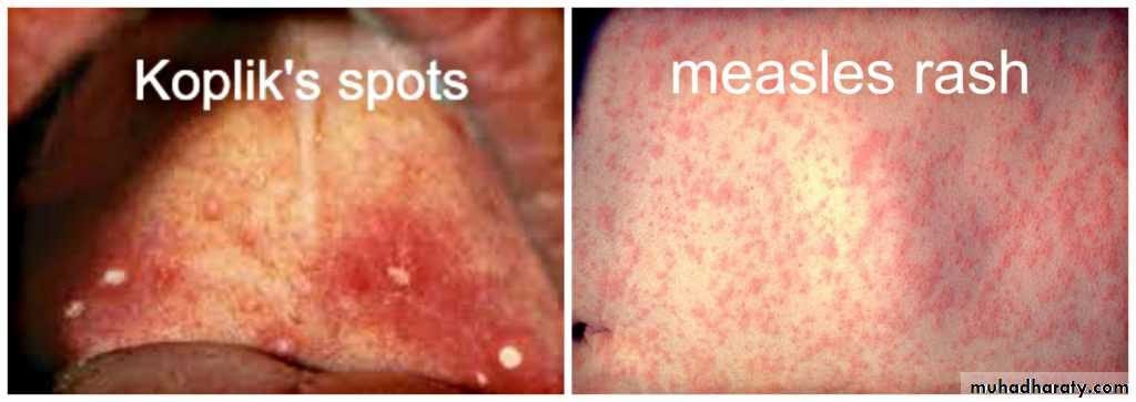 Measles classically presents with a prodrome of fever, cough, nasal congestion, and rhinoconjunctivitis.A pathognomonic enanthem, Koplik spots, appears during the prodrome and is composed of gray– white papules on the buccal mucosa.