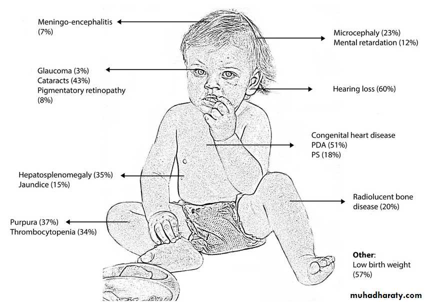 Rubella during pregnancy (1st trimester) associated with congenital abnormalities in the fetus in the form of cataract, cardiac defect and deafness.