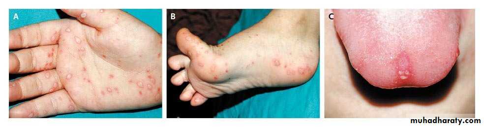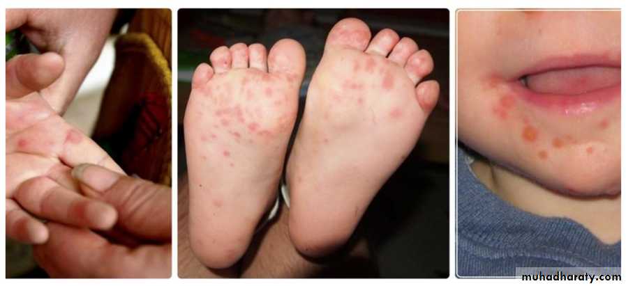 Hand and feet lesions: are red papules which quickly become small gray vesicles with red halo, oval and run parallel with skin line.