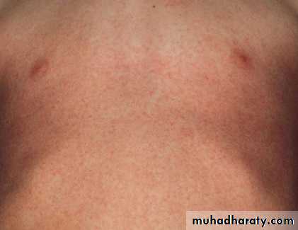 In the fourth day fever suddenly drop & morbilliform exanthems appear distributed on the trunk.