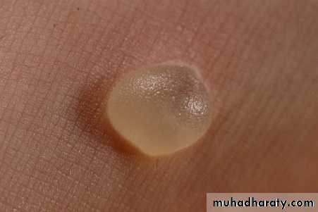 White papules on red baseTiny red macules or petechiae